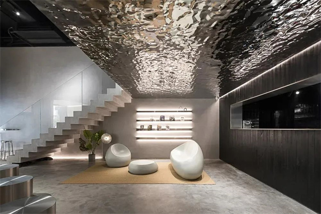 “水波紋板”顧名思義就是表面紋理類似水波蕩漾,裝飾性極強一種板材。作為吊頂等區域的點綴裝飾,不銹鋼的特殊材質使得空間從視覺上層次更豐富。